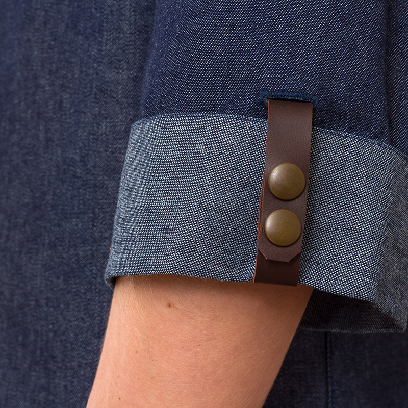Dvě možné polohy délky rukávu jistí efektní manžeta z hovězí usně. Funkční protizáhyb na zádech umožňuje volný pohyb a přitom drží tvar rondonu.