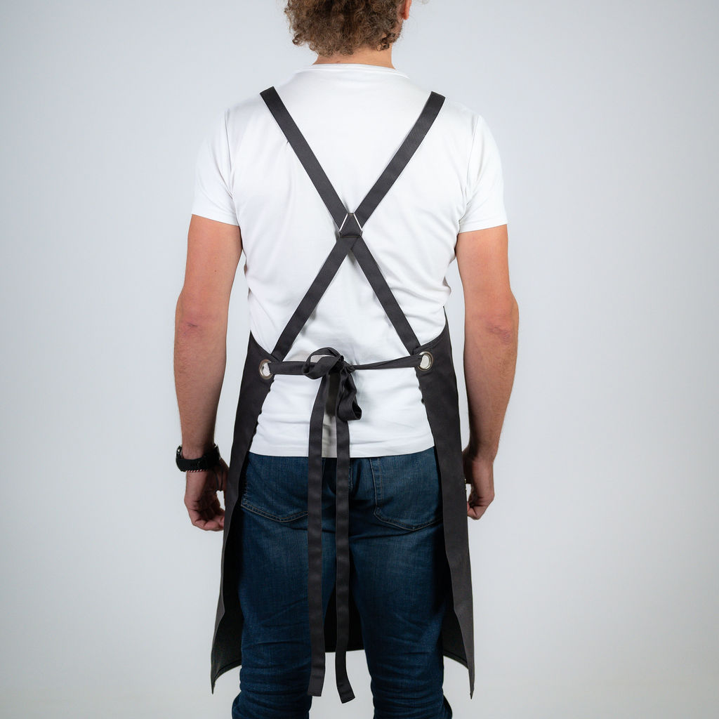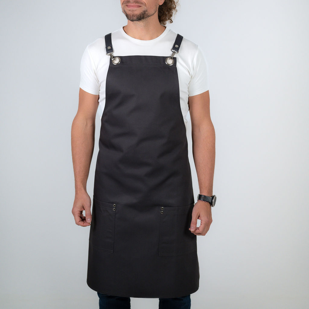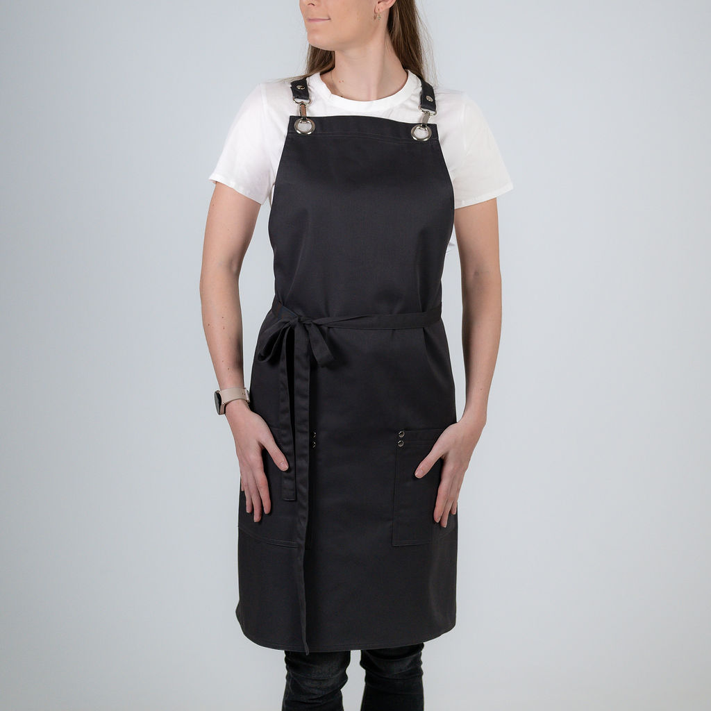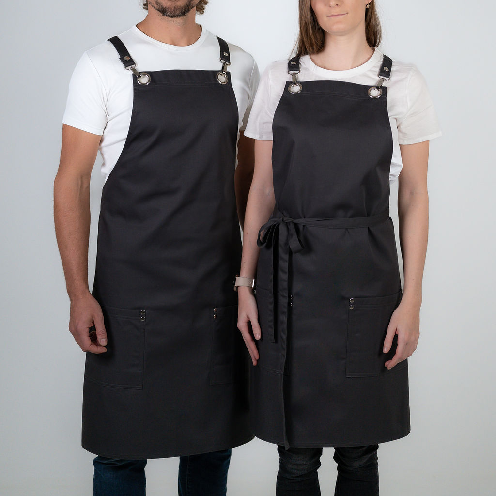 Zástěra prodloužená těsně pod kolena. Vhodná do luxusních restaurací, kde je žádoucí mít kolena zakrytá. Do dvou vyztužených kapes na bocích schováte všechny důležité věci, které potřebujete mít stále při ruce. Zástěra vás nijak neomezuje v pohybu a dělá velmi slušivou siluetu.
