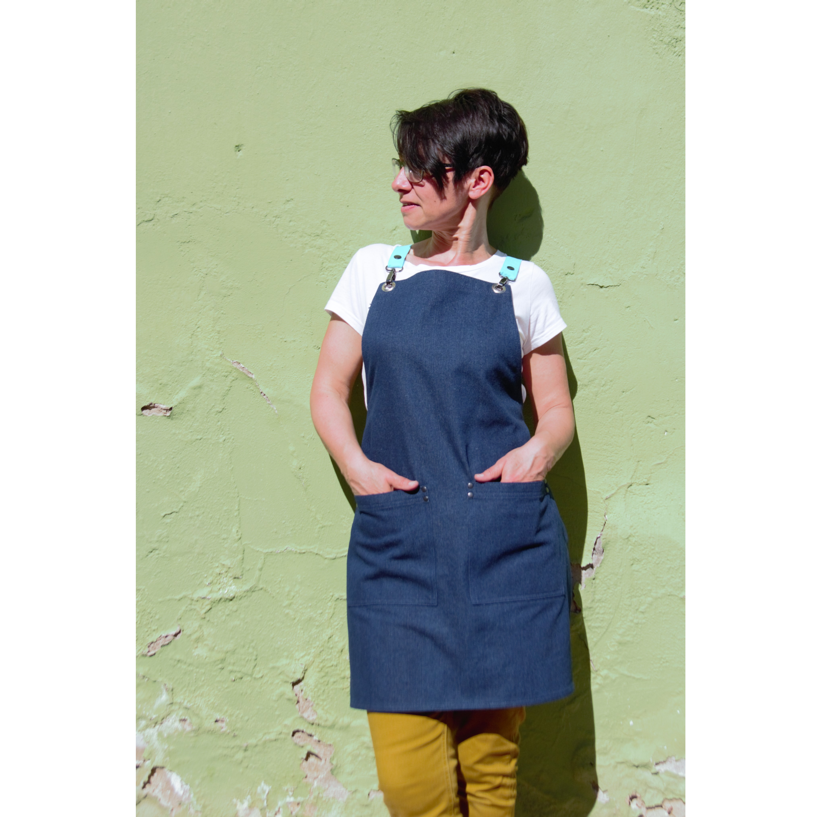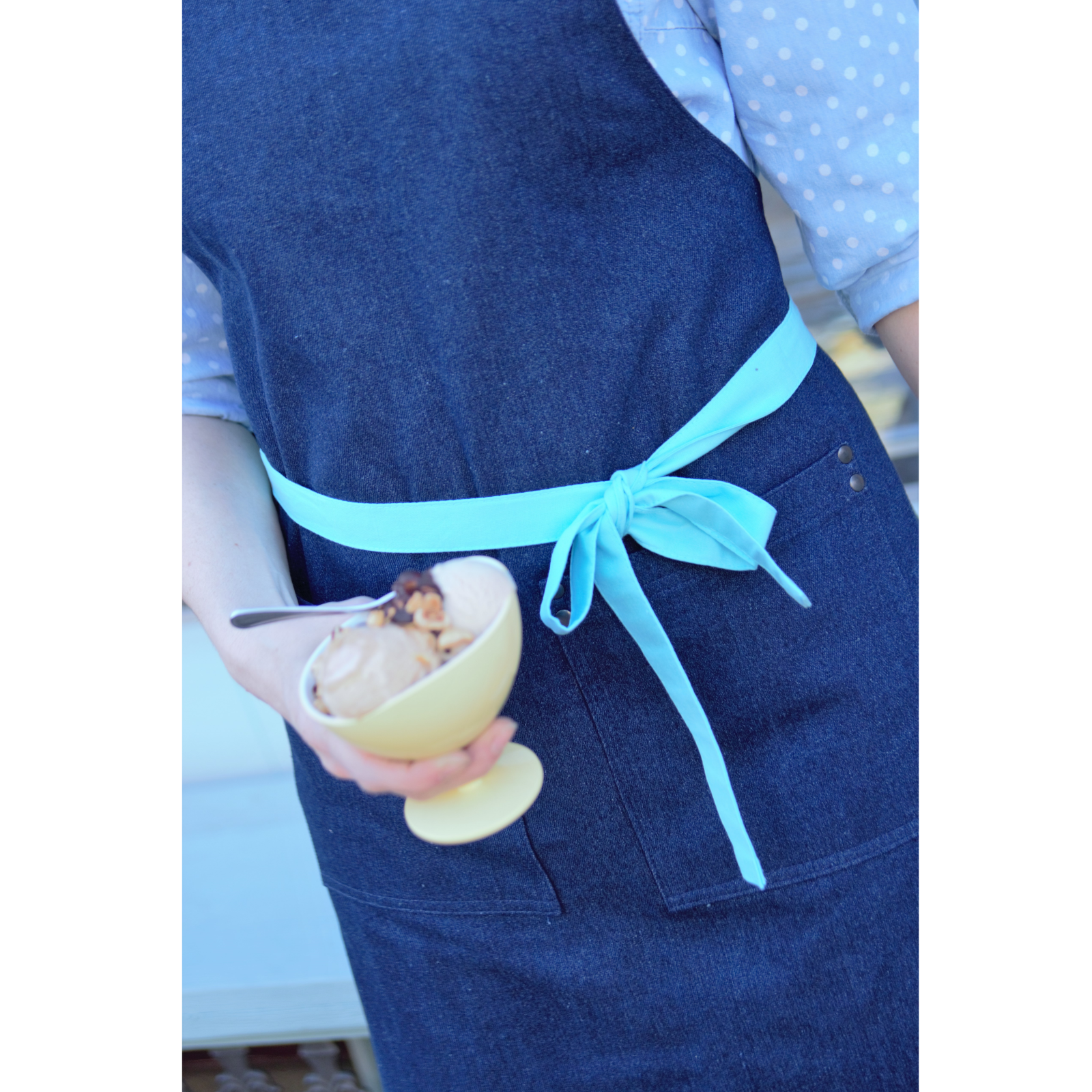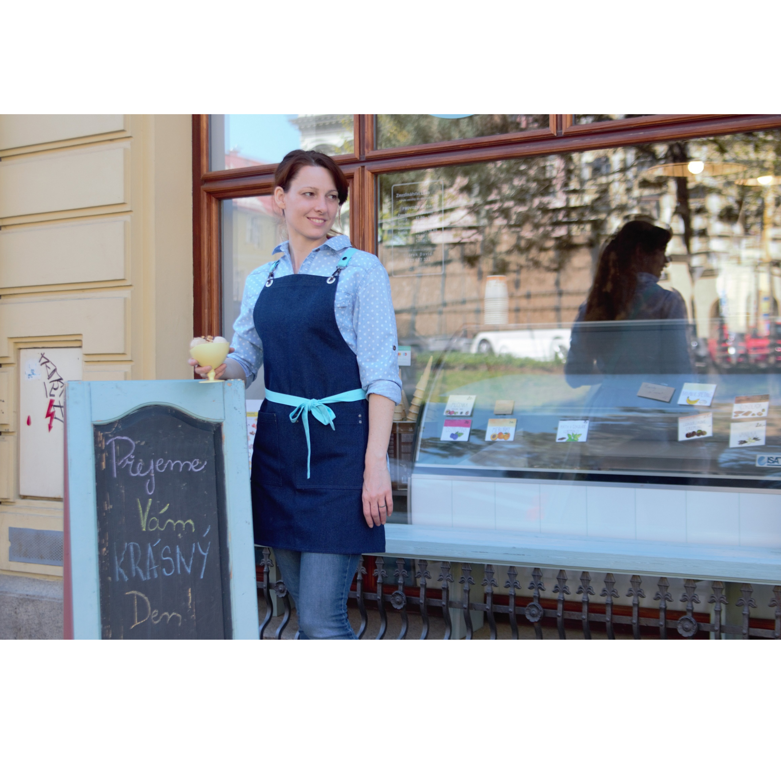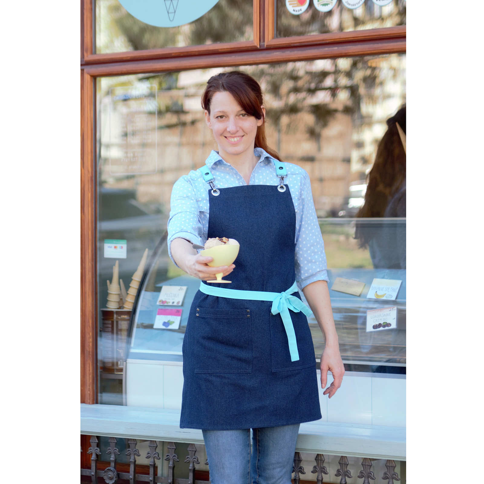 Klasická, ale přitom neokoukaná modrá riflová zástěra s odepínacími karabinami. Vyberte si barvu popruhů, která bude nejvíce ladit k vašemu podniku.