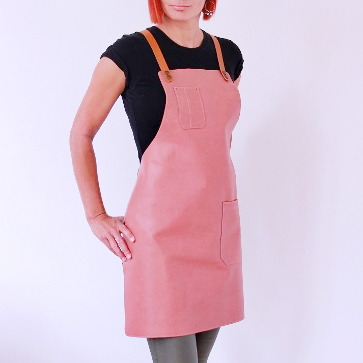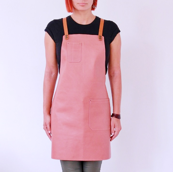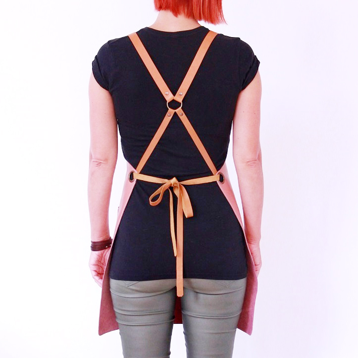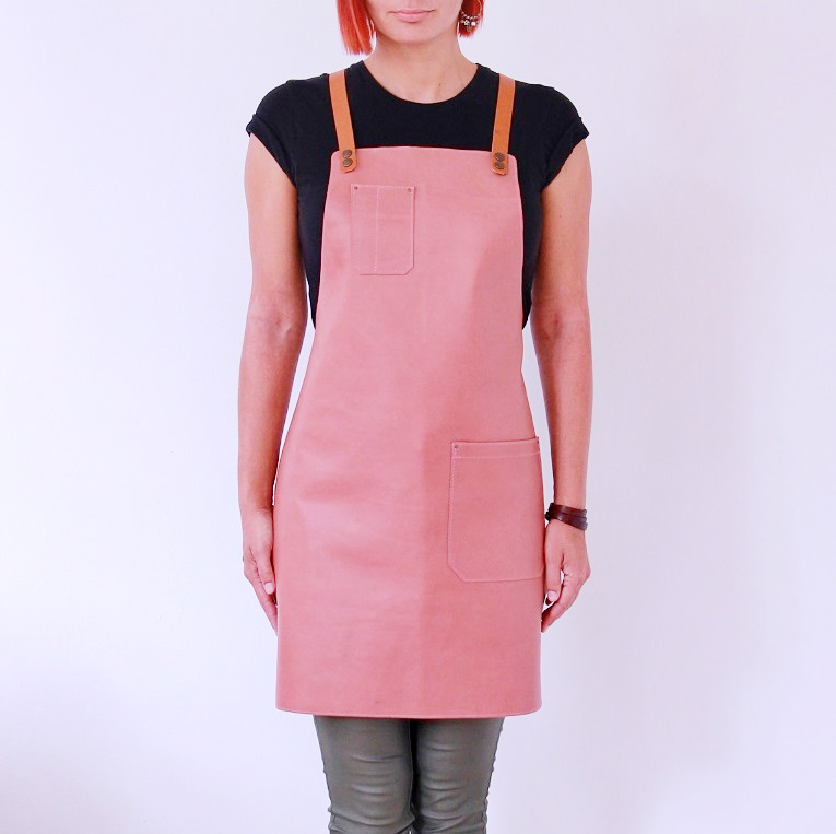 Dámská celokožená zástěra z hovězí anilinové usně o tloušťce 1,1 mm. Zástěra je po celém svém obvodu obšitá. Kapsy jsou zpevněny nýty. Popruhy křížem přes záda zaručují nadstandardně pohodlné celodenní nošení a kroužek uprostřed zad zamezuje padání popruhů z ramen. Horní pevnější část popruhů je z hovězí usně třísločiněné.