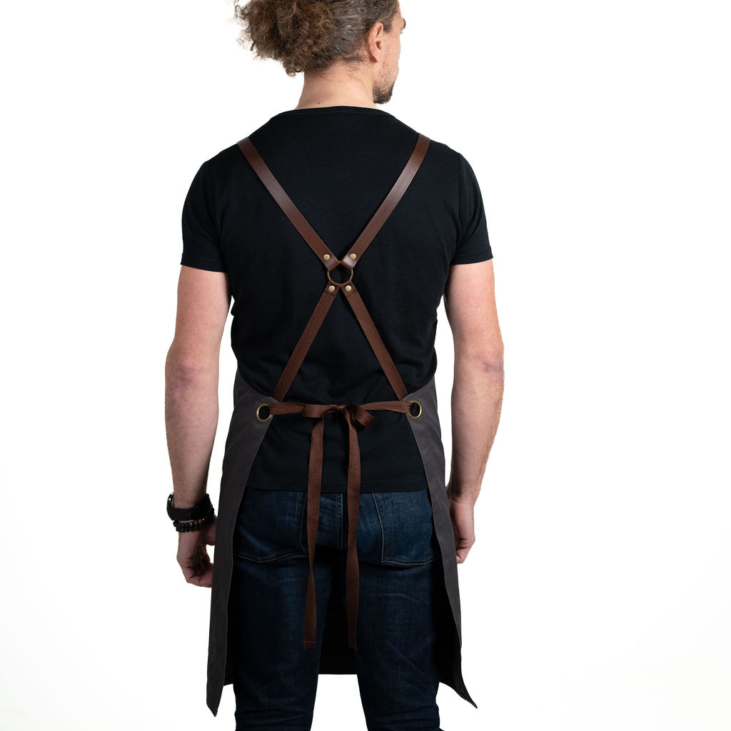Kombinace materiálu s nešpinivou nano úpravou a té nejkvalitnější toskánské hovězí kůže zaručuje vaší zástěře nadstandardně dlouhou životnost, nádherný design a zároveň dokonalou funkčnost při práci s nápoji a potravinami včetně olejů.