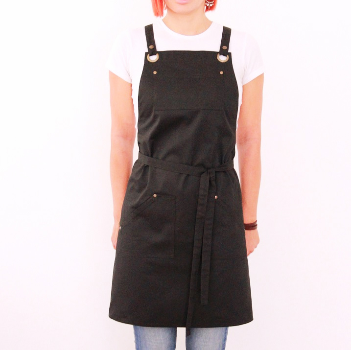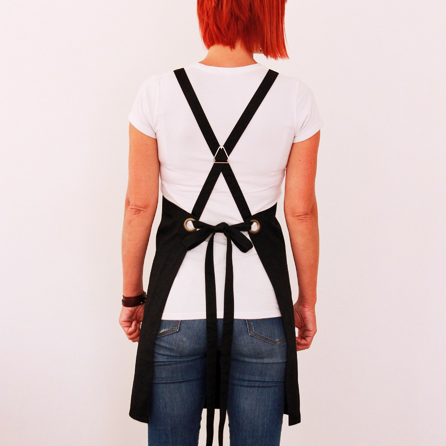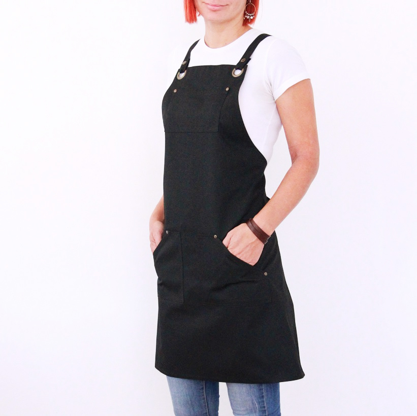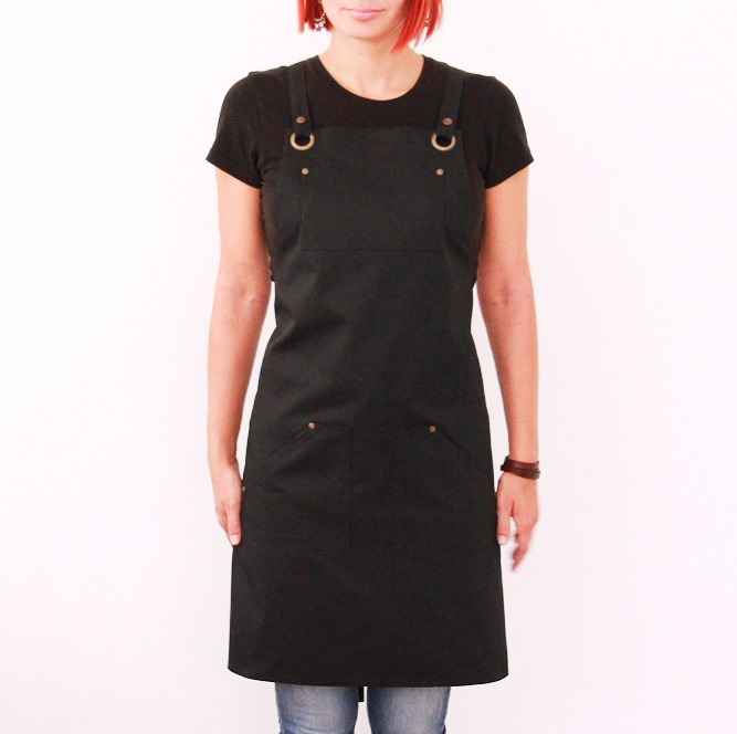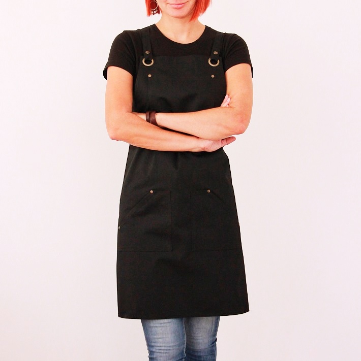 Zástěra z kvalitního plátna - kepru. Dvě kapsy dole, jedna kapsa na hrudníku s dvěma přihrádkami na tužku. Pohodlné, elegantní a variabilní zavazování křížem přes záda. Šlový trojúhelník drží popruhy na svém místě a nebudou vám padat z ramen. Odepínací popruhy pro snadnější praní. Mosazné nýty zabraňují vytrhávání kapes z látky při větší zástěži.
