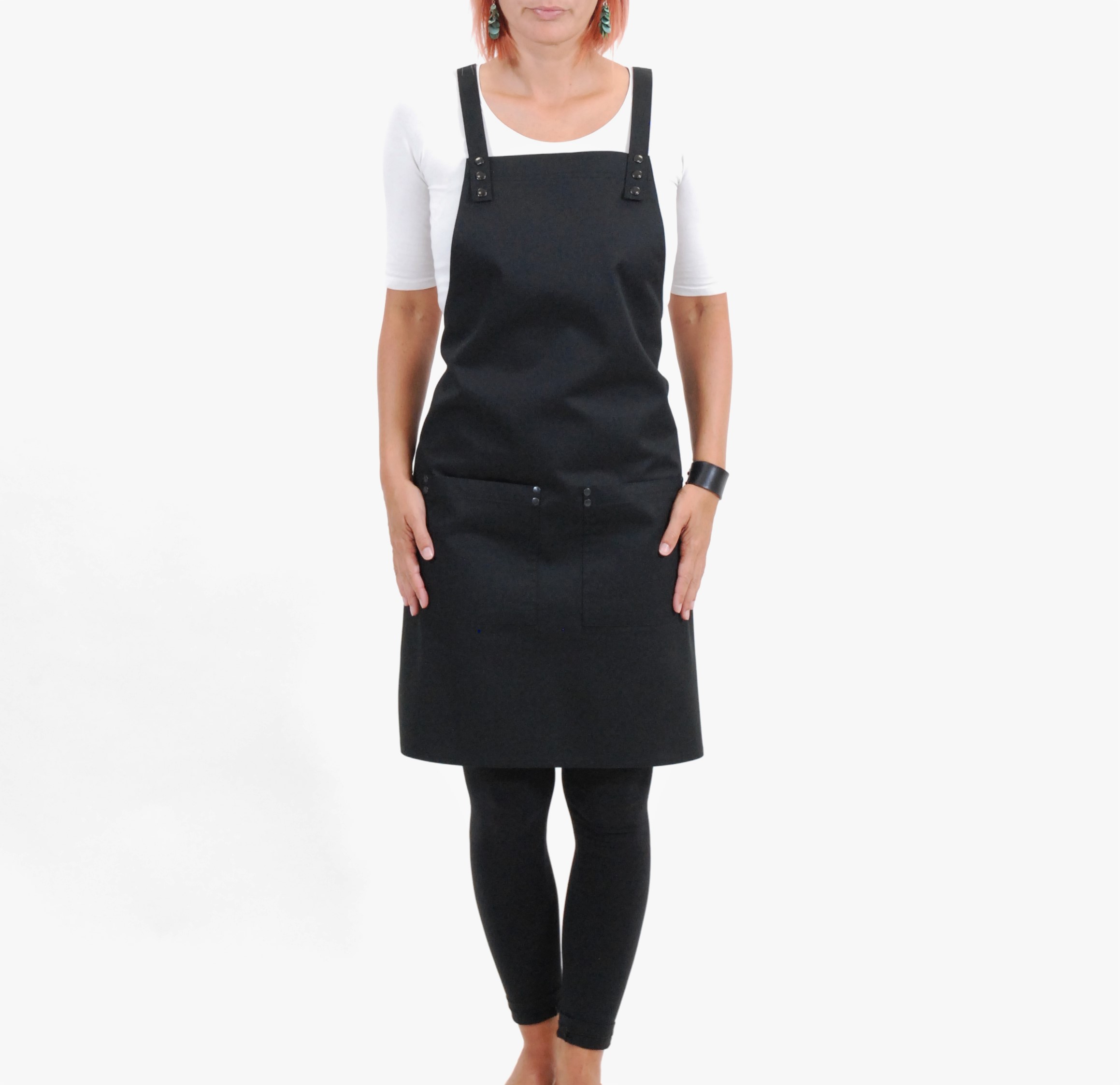 Zástěra SIMPLE vyniká svojí nenucenou elegancí. Popruhy křížem přes záda se velmi dobře a pohodlně nosí. Díky nim je zástěra velice variabilní na každou postavu. Upnutí na hrudníku je vždy na dva bytelné patenty. Zástěra má dvě nenápadné kapsy, které jsou zpevněny kovovými nýty, které zamezují vypárání kapsy z látky . Střih je univerzální a jako všechny naše modely dokonale padne mužům i ženám. Zástěru SIMPLE 1 standardně vyrábíme z černého kepru s kovovými doplňky v černém niklu a ve dvou velikostech.